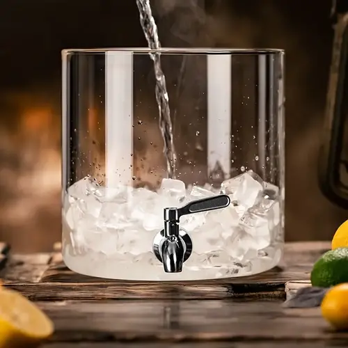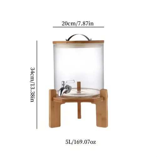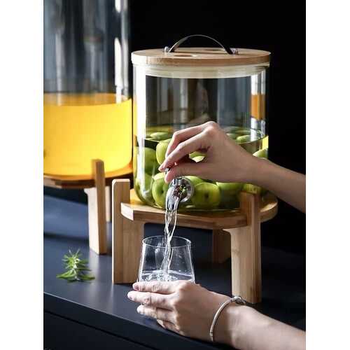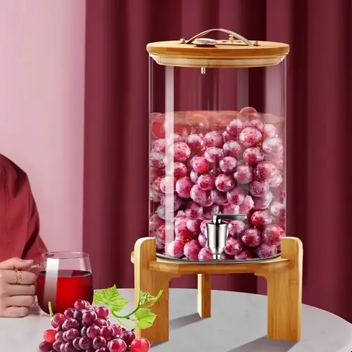Ky dispenser elegant prej qelqi borosilikat është zgjedhja ideale për festa, evente apo përdorim të përditshëm në shtëpi. Kombinimi i qelqit kristal të pastër me bazën dhe kapakun prej druri bambuje krijon një pamje tërheqëse dhe moderne që i shton stil çdo ambienti.
