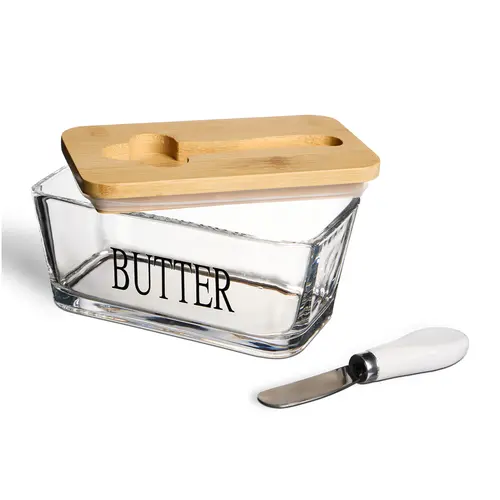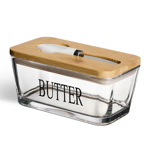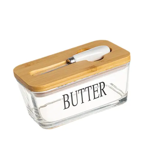 Enë e qëndrueshme për gjalp me bazë druri dhe enë qelqi, kapak mbyllës dhe prerës — ruajtje freskie dhe shërbim praktik në tryezë.