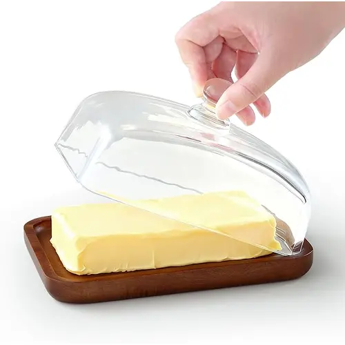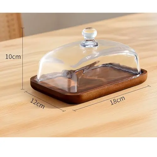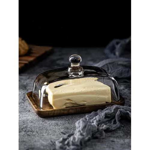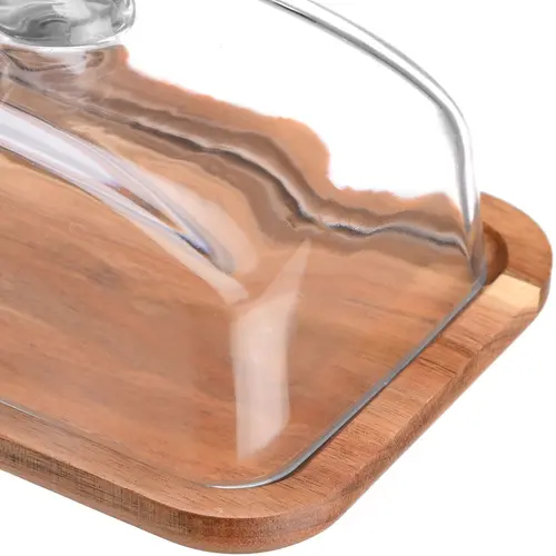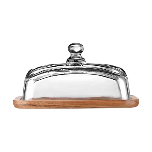 Enë elegante dhe praktike për gjalp, djathë dhe ushqime të lehta — bazament druri acacie dhe kapak qelqi me dorezë për hapje të lehtë dhe mbyllje hermetike.