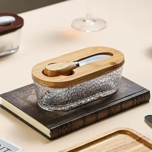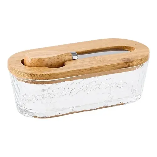 Kuti shumëfunksionale prej qelqi me kapak bambuje — ruan freskinë e gjalpit, ofron prerës/servis praktik dhe është e lehtë për t'u pastruar. Kapacitet 300 ml.