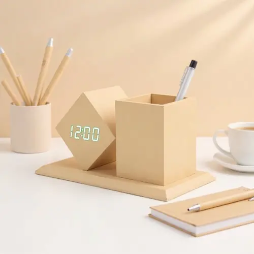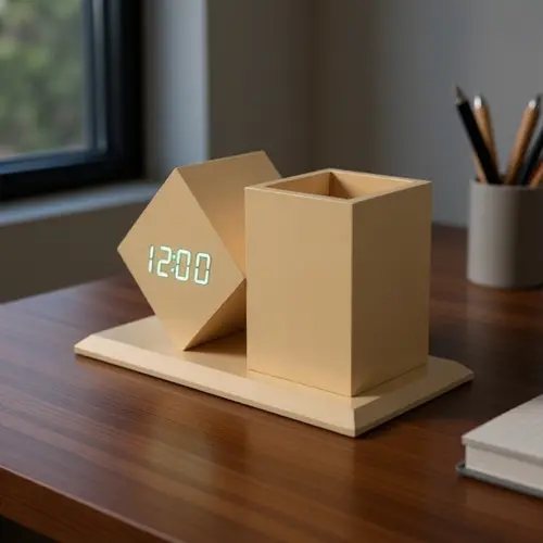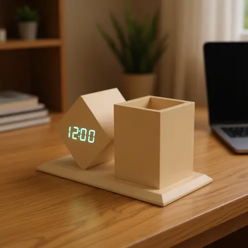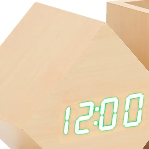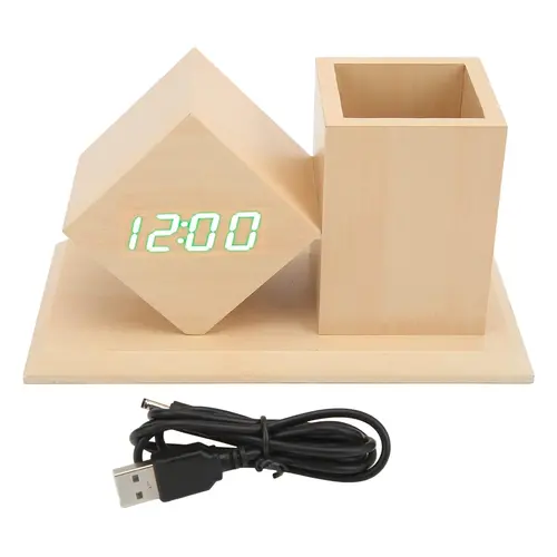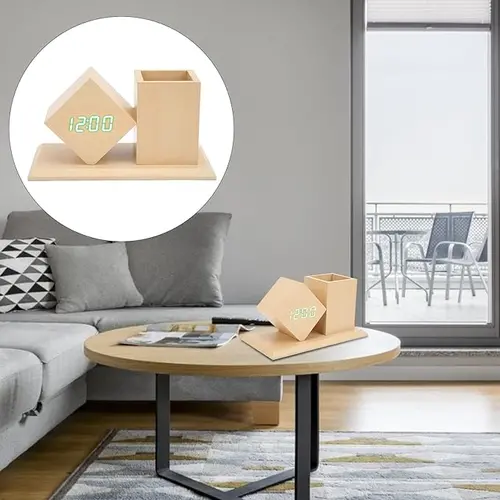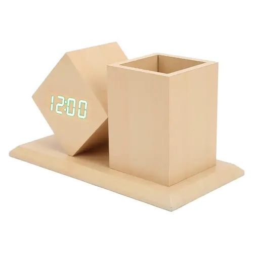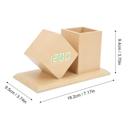 Kjo orë moderne LED kombinon praktikën me dizajnin minimalist, duke ofruar një orë alarmi shumëfunksionale dhe një mbajtëse të dobishme për stilolapsa e aksesorë të vegjël. Ideale për tryezën e punës, komodinë ose hapësirën tuaj të studimit.