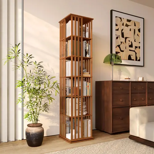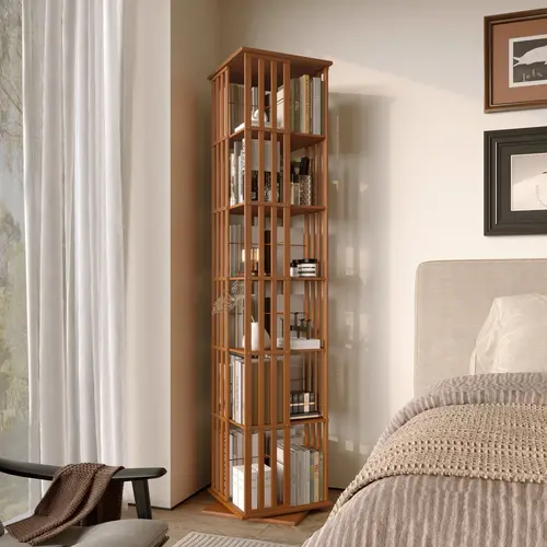Raft kompakt 6‑nivelesh prej bambuje, me bazë dhe konstruksion të qëndrueshëm dhe funksion rrotullues 360°—kapacitet rreth 120–150 libra, ideal për kursim hapësire dhe ekspozim.