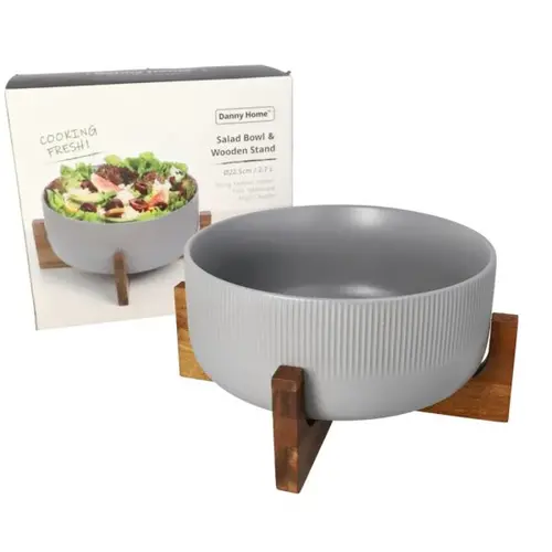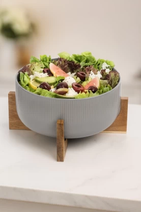 Ky tas sallate është kombinimi perfekt i funksionalitetit dhe stilit. I punuar me kujdes dhe me dizajn modern, ai është ideal për përgatitjen dhe servirjen e sallatave të freskëta. Korniza e drurit i jep një pamje natyrale dhe elegante që përshtatet me çdo ambient kuzhine apo tryezë ngrënieje.