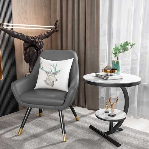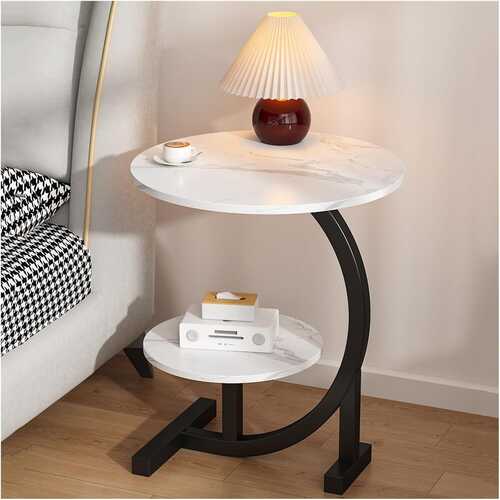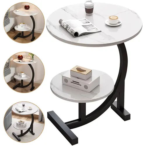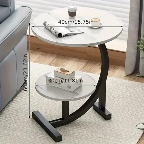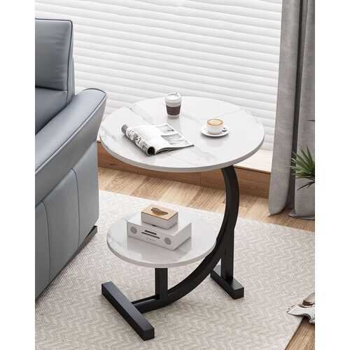 Tavolinë anësore elegante me sipërfaqe MDF imitim mermeri dhe bazë metalike për stabilitet. Set 2‑në‑1 për funksion dhe stil në korridor, sallon apo dhomë ngrënieje.