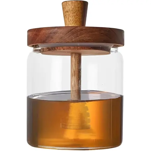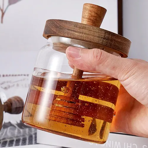 Enë elegante prej qelqi me kapak druri dhe vulë silikoni dyfishe — i papërshkueshëm nga rrjedhjet, gryka e gjerë për servirje pa rrëmujë dhe akses të lehtë në mjaltë.