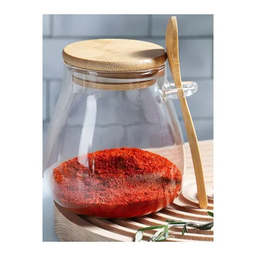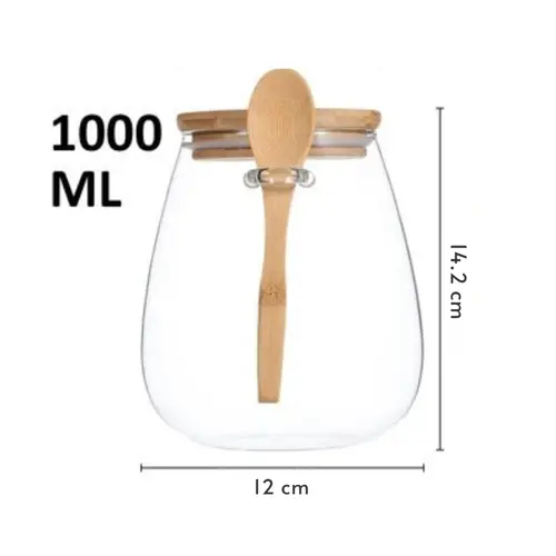Kavanoz qelqi i sigurt për ushqim me kapak bambuje hermetik dhe lugë të bashkangjitur. Qelq borosilikat i qëndrueshëm ndaj temperaturave, pa BPA dhe i riciklueshëm.